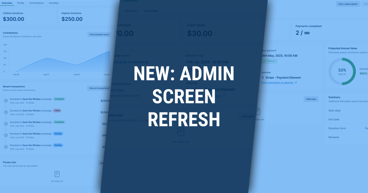 Our refreshed admin screens are now cleaner, faster, and more intuitive β designed to highlight the insights you need most. From smarter donor stats to visualized giving trends, staying informed and in control has never been easier. |